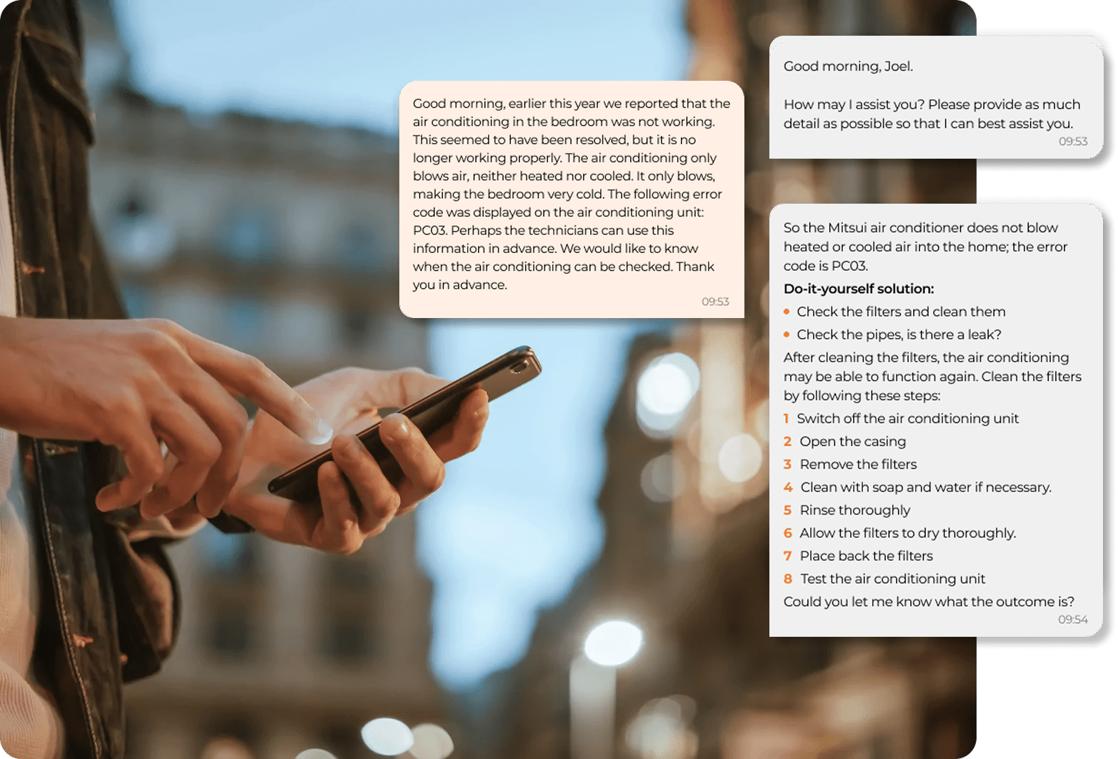 Tenant Chat quickly and efficiently recognizes and answers common tenant questions. The chatbot provides instant solutions and can direct tenants to relevant information. For technical issues or complex problems, Tenant Chat automatically notifies the property manager, enabling swift action. This improves service while saving time for both tenants and property managers.